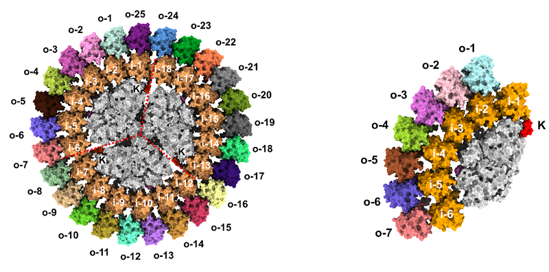 Figure: Cryo-EM structures of the cyanobacterial photosynthetic complexes PSI3-IsiA43 (left) and PSI1-IsiA13 (right)