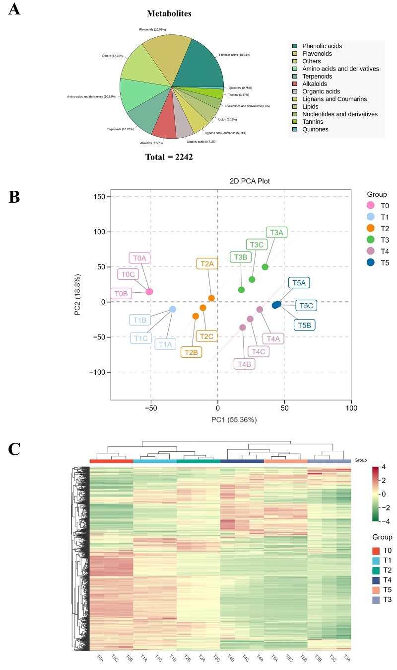 To simulate the bloating process, the researchers incubated CRRTJ at 50°C and analyzed samples taken at multiple time points using UPLC-QTRAP-MS/MS. A total of 2,242 metabolites were identified, spanning twelve chemical classes including alkaloids, flavonoids, amino acids and their derivatives.