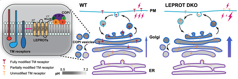 Functional studies revealed that this Golgi retention is critical for receptor maturation. Measurements of glycosylation, palmitoylation, signaling responses, and receptor localization showed that LEPROTs control TM receptor activity by promoting proper Golgi residency and post-Golgi modification.