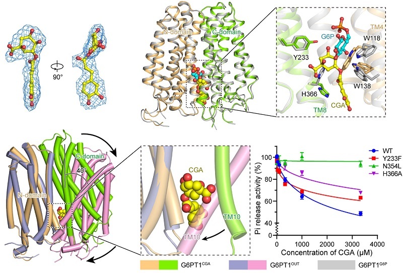 The study also demonstrates that CGA binds to G6PT1 in the inward-facing conformation in a manner resembling a "molecular wedge," partially occupying the G6P binding site while strongly stabilizing this conformation. By preventing the transition to the outward-facing state, CGA effectively locks the transport cycle, and the nonconservation of its binding residues among other SLC37 family members provides a structural basis for the development of highly selective G6PT1 inhibitors.
