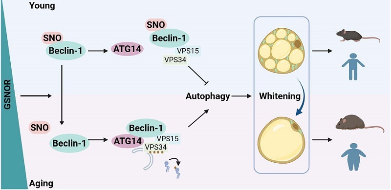 GSNOR mediates the denitrosation of Beclin-1 at cysteine 351. This modification enhances the interaction between Beclin-1 and ATG14, thereby activating autophagy. Excessive autophagy accelerates mitochondrial clearance within cells, leading to the loss of beige adipocyte characteristics and promoting adipose tissue whitening, ultimately resulting in obesity.