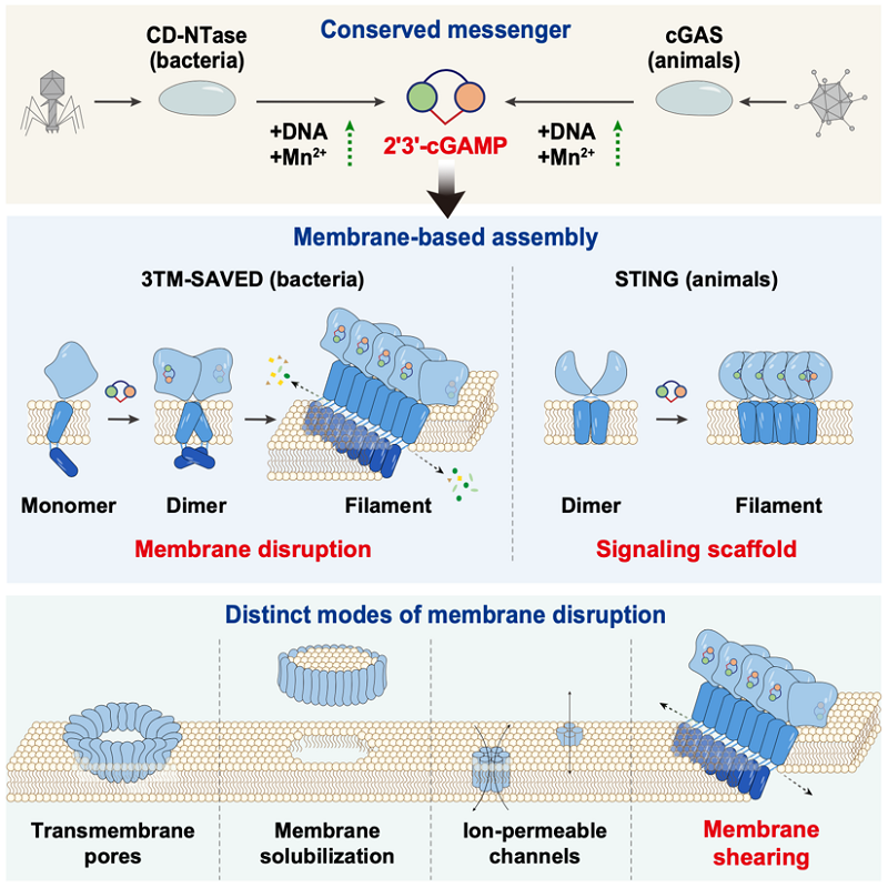The researchers further focused on a representative and widespread class of transmembrane effectors-3TM-SAVED. The results showed that these proteins exist as monomers in the resting state; upon specific recognition of 2'3'-cGAMP, they first form a transient dimeric intermediate and then assemble into higher-order filaments. Structural and functional analyses demonstrated that 2'3'-cGAMP directly participates in and stabilizes the protein assembly interfaces, driving the protein stepwise from a resting state into an activated state.